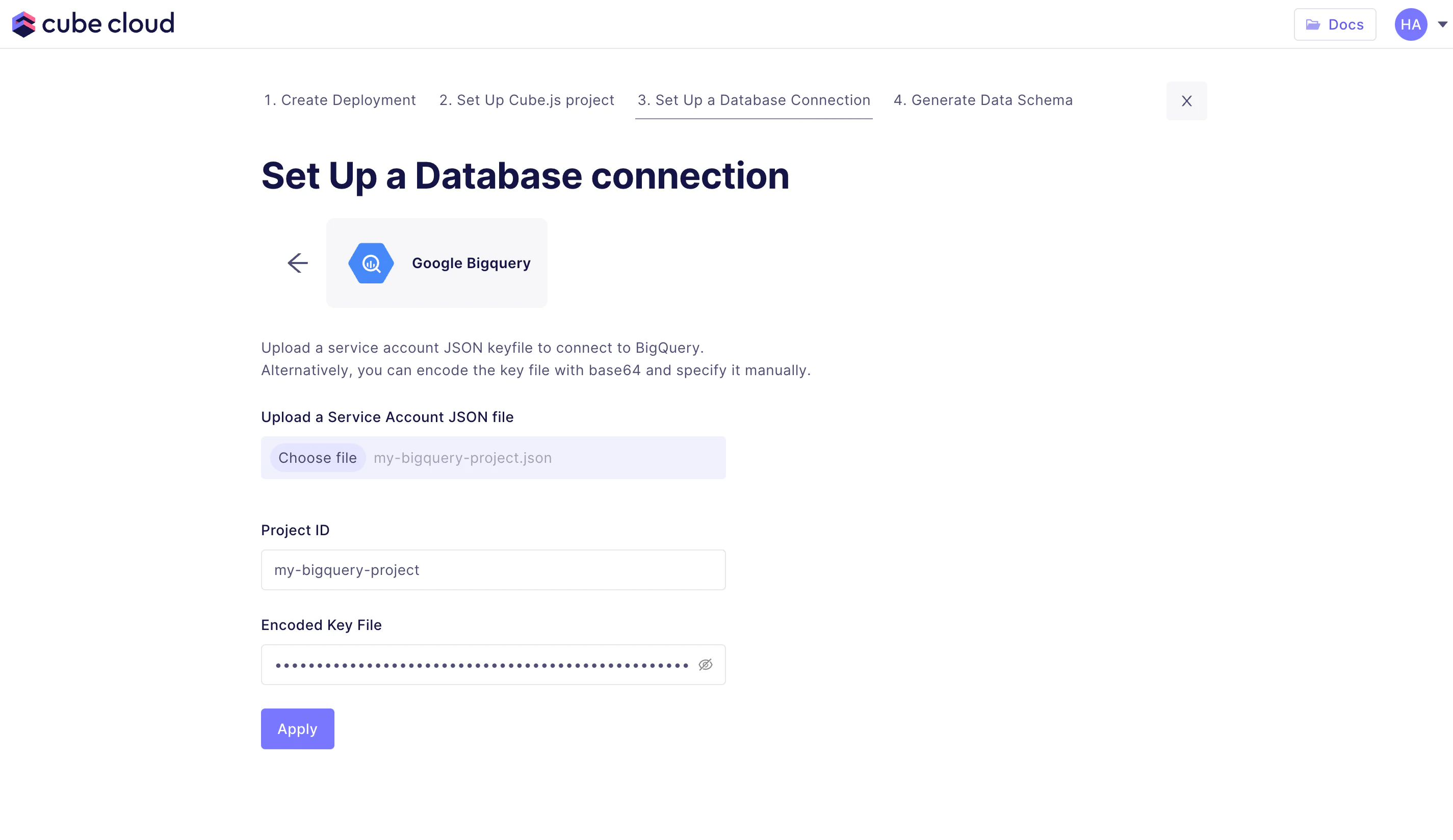 CUBEJS_DB_BQ_CREDENTIALS=$(cat /path/to/my/keyfile.json | base64)